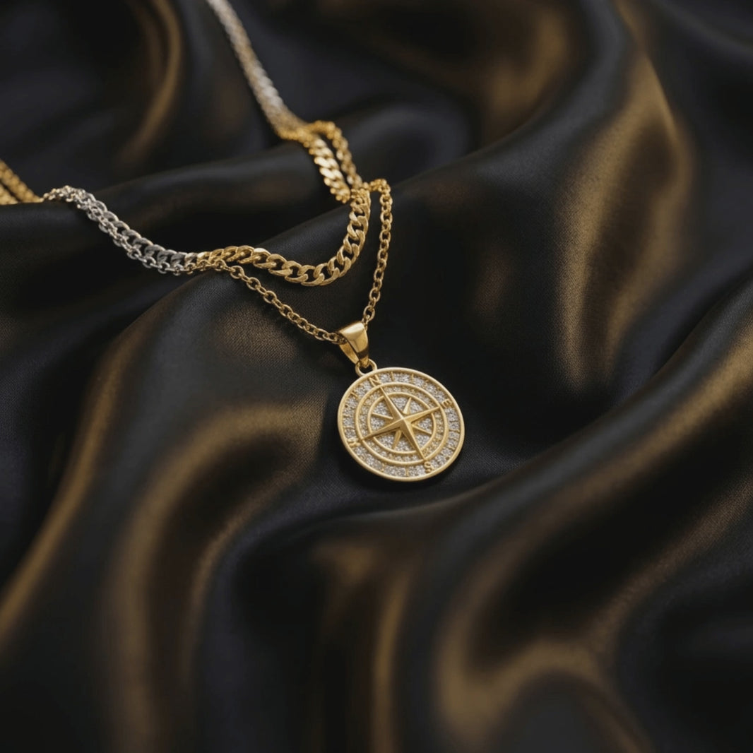 Gold Set - Compass and 5mm Rope Chain Necklace