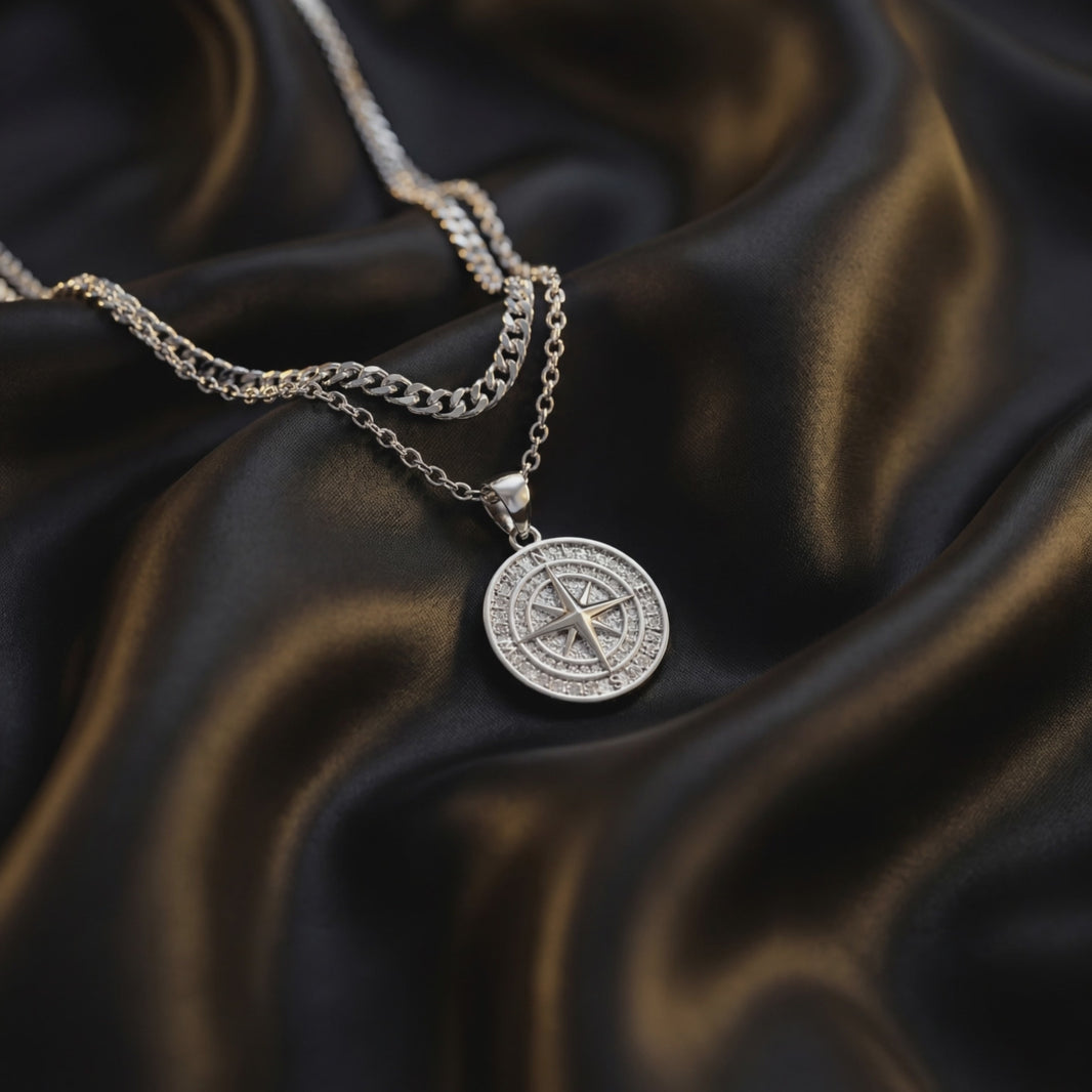 SILVER SET - COMPASS AND 5MM ROPE CHAIN NECKLACE